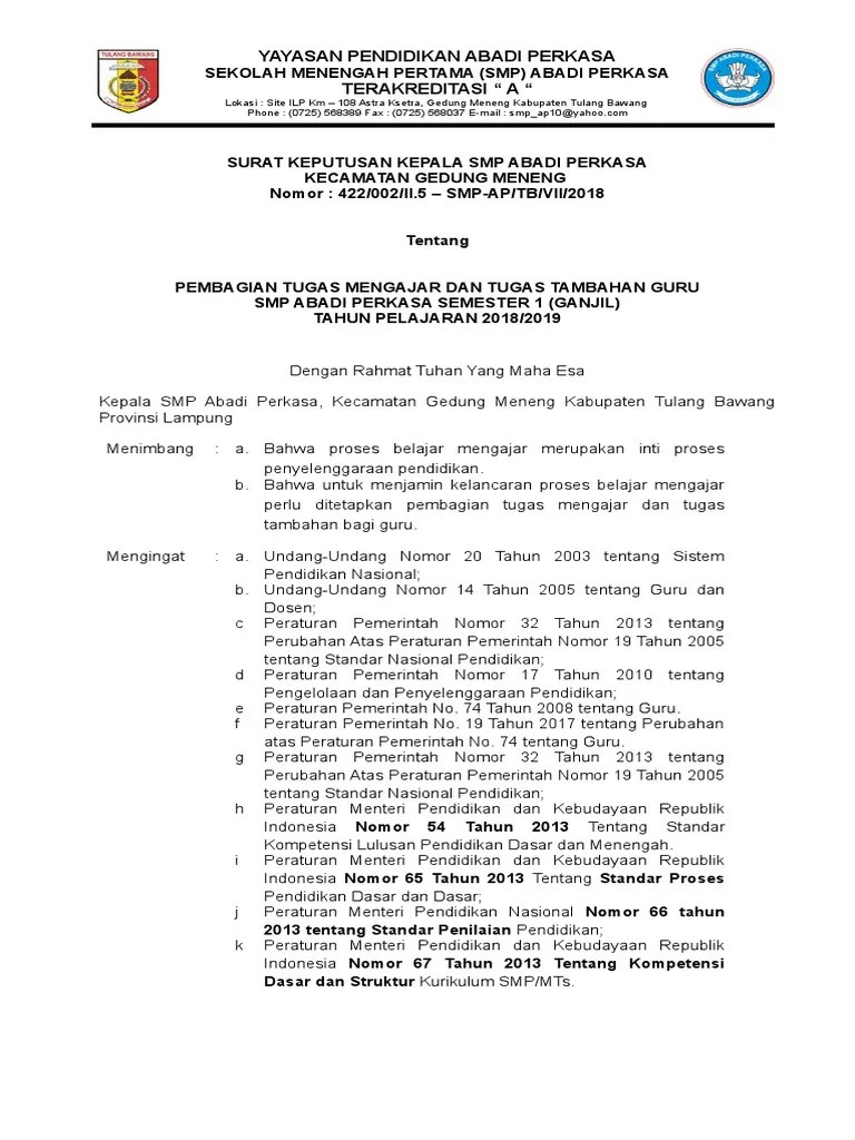Surat keputusan kepala sekolah menengah atas. Sk pembagian tugas guru by hizkia_syah. Dalam kelancaran proses pembelajaran di sekolah, setiap tahunnya sekolah menerbitkan surat keputusan pembagian tugas guru mengajar. Dokumen ini menjadi bukti bahwa . Sk pembagian tugas mengajar (ptm) merupakan dokumen yang wajib dibuat sekolah pada awal tahun pelajaran.